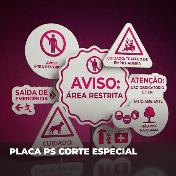 Placas de PS personalizado, ideais para sinalização de alto impacto e credibilidade. Transmita profissionalismo e qualidade com versatilidade.